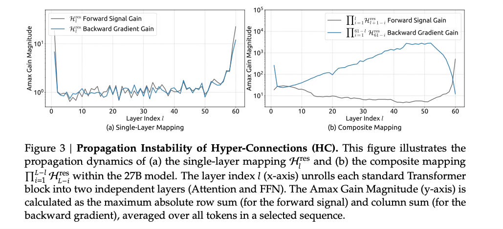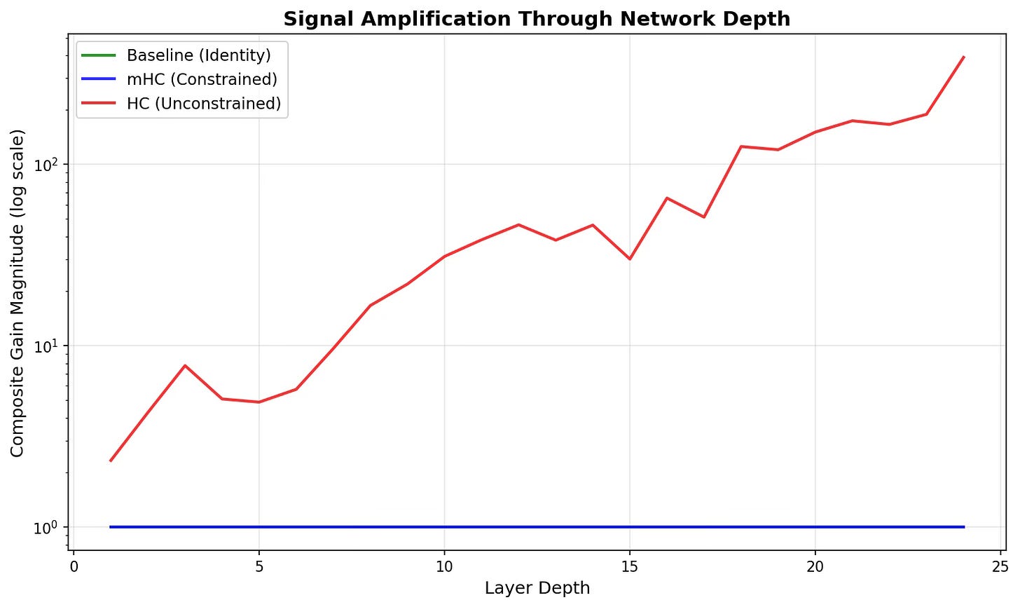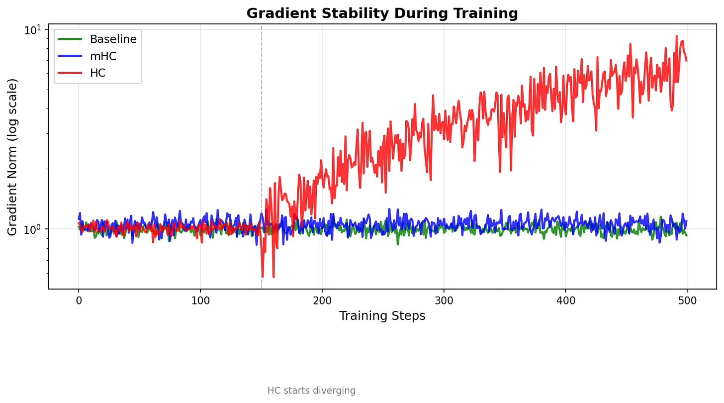 But the core premise of the paper holds up well in our toy simulation. HC’s Unconstrained mixing matrices amplify signals exponentially. mHC’s doubly stochastic constraint prevents it from exploding.
