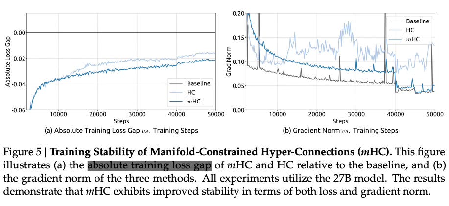 The 27B HC model showed loss surges and gradient explosions at 12,000 steps. mHC trained smoothly with no instability.