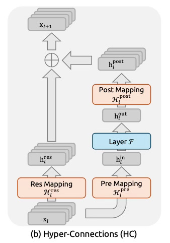 Hyper-Connections (HC), published in 2024 by ByteDance, expanded this one lane to multiple parallel lanes. Instead of one residual path, HC uses four streams that exchange information via learned mixing matrices.